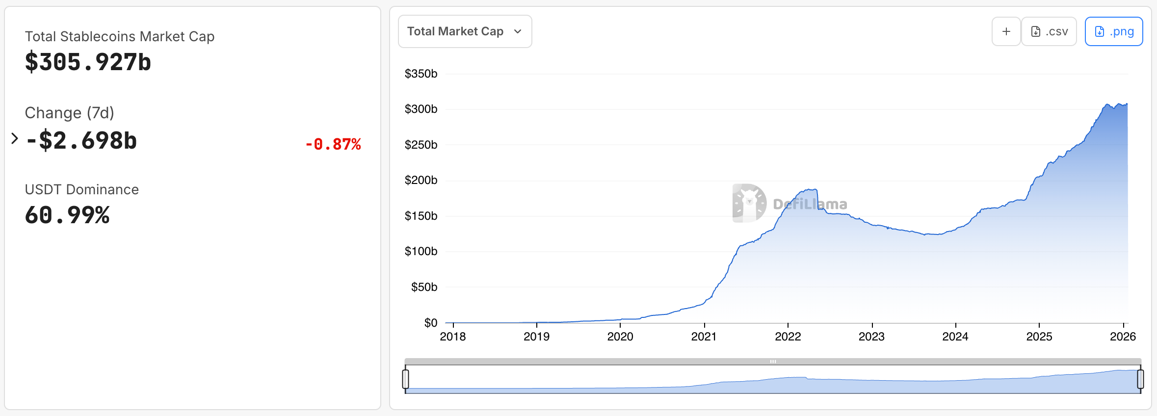 the chart: stablecoin market cap. three hundred five billion and climbing. the new pipes filling up.
