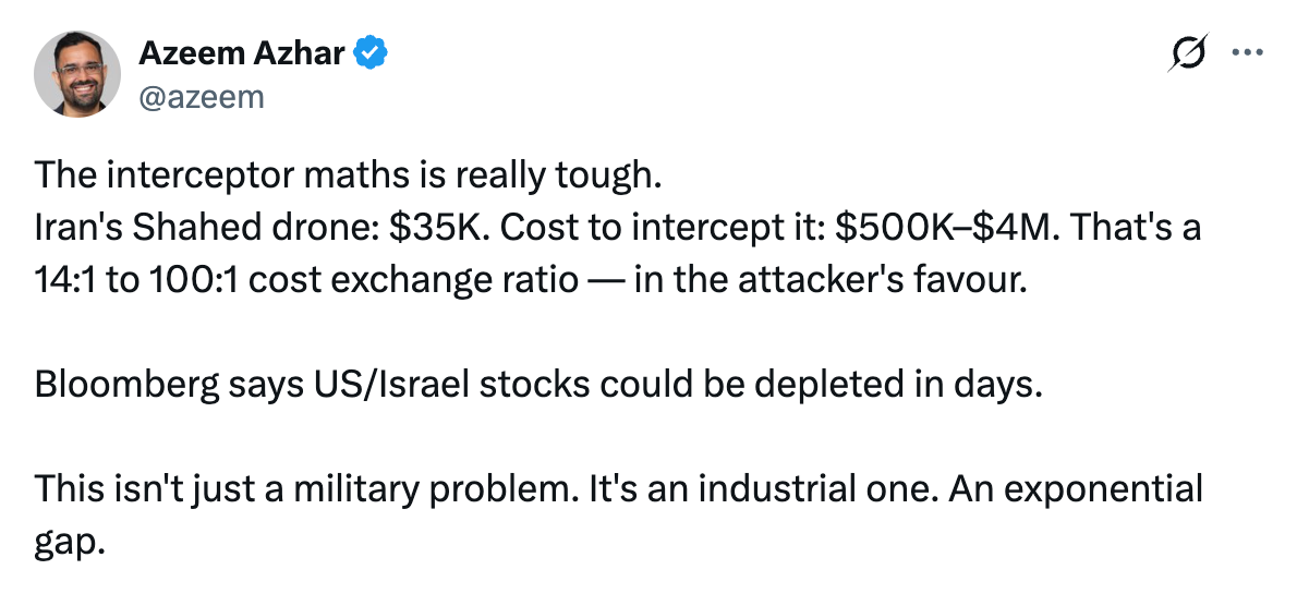 that argument is real. but it rests on whether they can find launchers faster than iran can relocate them, and whether the stockpile holds in the meantime. each iranian drone costs roughly thirty-five thousand dollars to build. each US intercept costs between five hundred thousand and four million. the math is uncomfortable regardless of whose numbers you use.