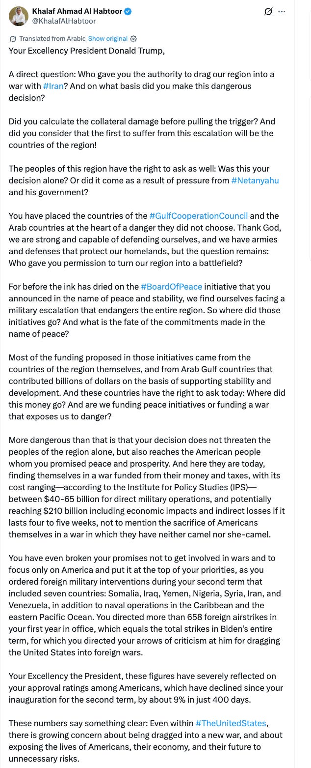 the GCC open letter barely made the front pages. the saudi-led bloc of gulf states, the region the US is supposedly protecting, publicly rebuked trump. estimated forty to sixty-five billion in direct costs, two hundred ten billion with spillover. the alliance that keeps global oil priced in dollars is quieter and more fragile than it looks.
