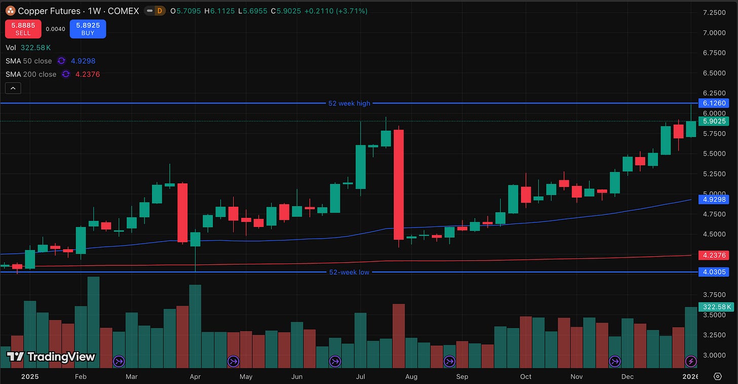 the chart: copper futures (hg). new fifty-two week high, up fifty-one percent in the last year. is the scarcity already priced or is this just the beginning?