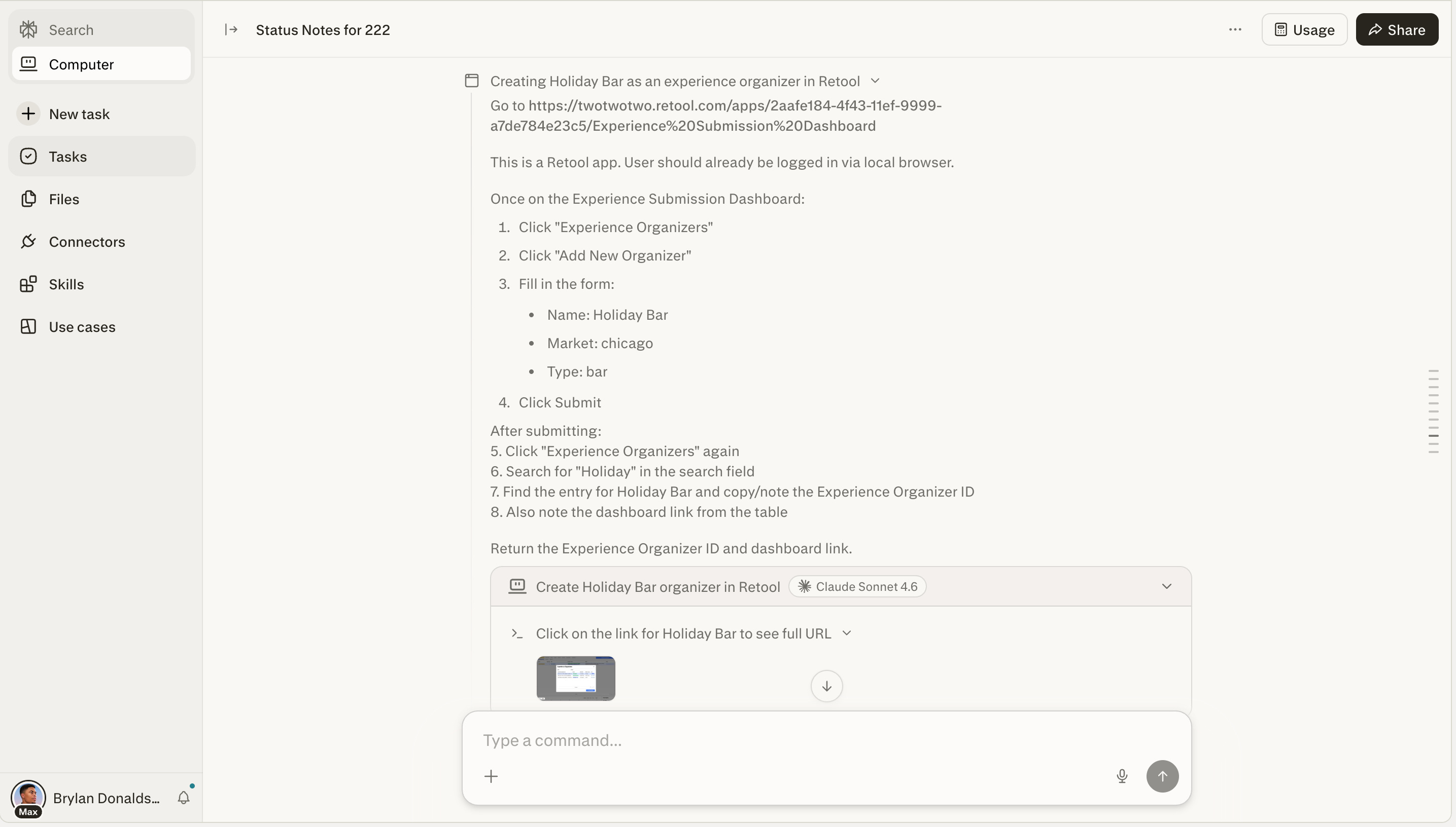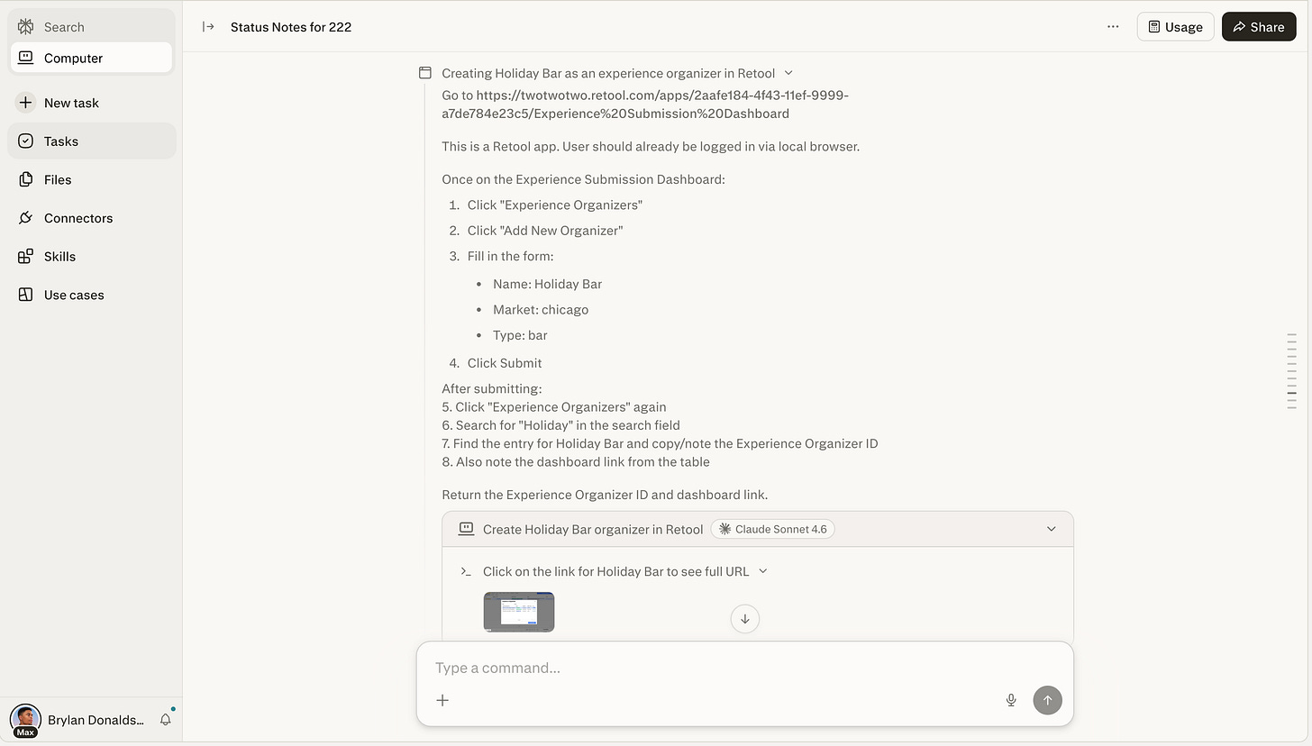 for example, i onboarded partners in atlanta. this requires creating the partner in the system, setting up dashboards, drafting the emails, looking up contacts. a task that requires twelve steps. and back and forth across multiple tabs. this is just one example of where i provided the context. the machine handled the execution.